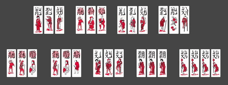 Hai hàng này sẽ hợp lại thành 27 loại quân bài và chia thành ba hàng gồm Văn (Nhất Văn đến Cửu Văn), Vạn (Nhất Vạn đến Cửu Vạn), Sách (Nhất Sách đến Cửu Sách).